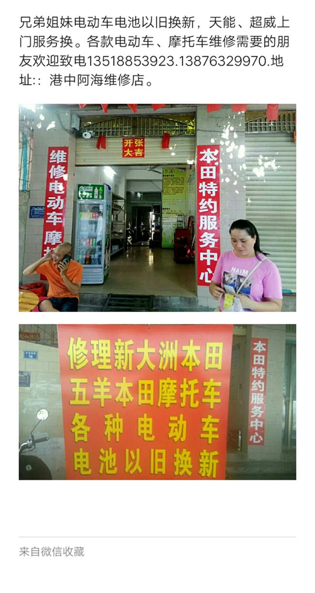 港中阿海维修店开业了,欢迎各位新老客户过来保养你们的本田车、电动车。电池以旧换新市内免费上门服务!师傅:新大洲本田阿海师傅!电话:13518853923.13876329970.