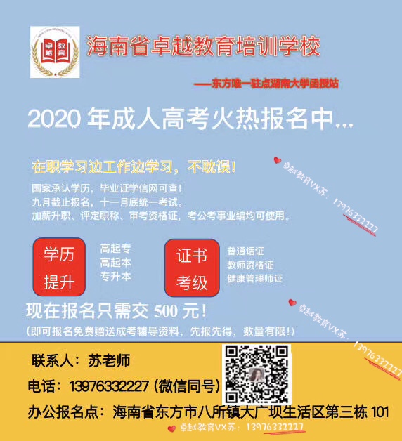 海南省卓越教育-在东方设点函授站。今年报名截止只剩最后20天!需要提升学历(大专,本科)☎️13976332227联系或添加微信,苏老师。全国可报,学历不限。现报名只需500!赠送材料,通过率达90%..